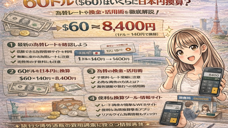 未分類 未分類 60ドルはいくらに日本円換算?為替レートや換金・活用術を徹底解説 「60ドルって、日本円でどれくらいの価値があるの?」と疑問に感じたことはありませんか。たとえば、【1米ドル=153.50円】の最新為替レートなら、60ドルは【9,210円】となります(2024年6月時点)。しかし、為替レートは日々変動し、送... 2026.01.09 未分類