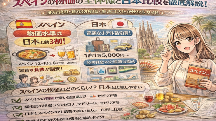 未分類 未分類 スペインの物価の全体像と日本比較を徹底解説!旅行費用・都市別相場・生活コストが分かるガイド スペイン旅行や移住を考えるとき、現地の物価がどれほどかかるのか気になりませんか?例えば、バルセロナ市内のカフェではコーヒー1杯が約1.5ユーロ、ランチは平均13ユーロほど。マドリードの月間家賃相場はワンルームで約800ユーロ、地方都市なら5... 2026.01.09 未分類